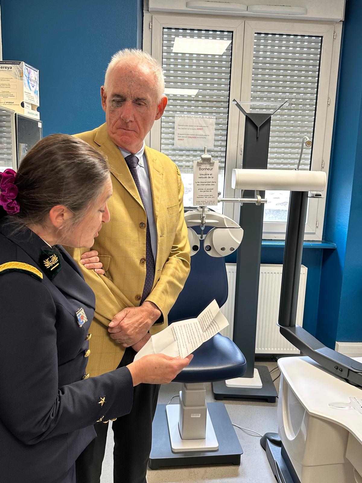 Le 16 septembre 2025, à l'invitation de madame la pharmacienne générale Isabelle DROUILLARD, médecin chef de l'HRIA Clermont-Tonnerre, et du médecin en chef Morgane VANIMSCHOOT, cheffe du service d'ophtalmologie, le président Pierre TRICOT s'est rendu à Brest pour procéder à la remise officielle de ces 2 équipements offerts par la Fondation.